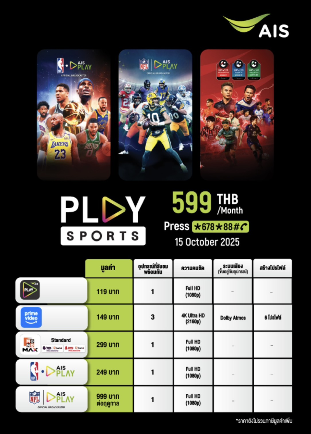 แพ็กเกจ PLAY SPORTS ราคา 599 บาทต่อเดือน (ไม่รวม VAT) รับชมช่องพรีเมียมและรายการกีฬาระดับโลก รวมถึงการแข่งขันกีฬาสุดมันส์ที่ทุกคนรอคอย ไม่ว่าจะเป็น พรีเมียร์ลีก, NFL และ NBA ผ่าน AIS PLAY พร้อมเต็มอิ่มกับคอนเทนต์จาก Prime Video และ Monomax สมัครกด *678*88# โทรออก (เปิดให้สมัครตั้งแต่วันที่ 15 ตุลาคม 2568 เป็นต้นไป)