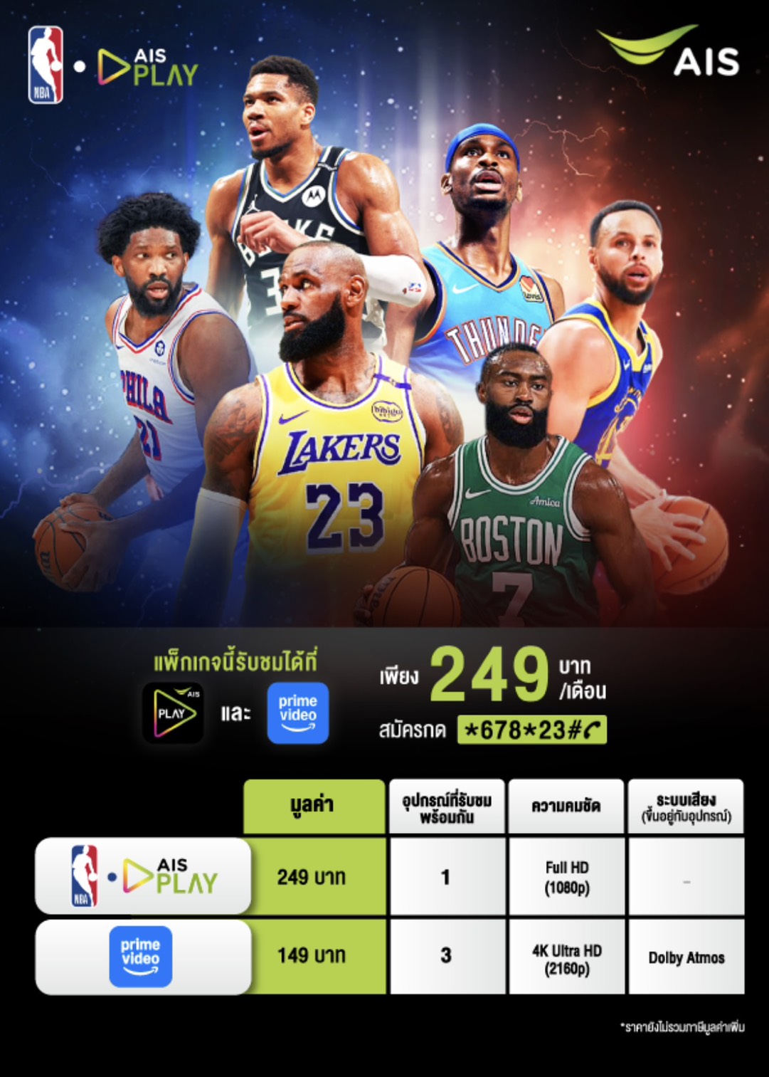 AIS PLAY ตอกย้ำจุดยืนการเป็นศูนย์กลางความบันเทิงและกีฬาอันดับ 1 ของไทย มอบประสบการณ์รับชมการแข่งขัน NBA แบบจัดเต็ม เปิดให้บริการแพ็กเกจ “NBA 2025-26” ราคาเริ่มต้นเพียง 249 บาทต่อเดือน (ไม่รวม VAT) ตอบโจทย์ไลฟ์สไตล์ของคนรักกีฬาและคอสตรีมมิ่ง ให้สามารถรับชมศึกบาสระดับโลก พร้อมด้วยความบันเทิงระดับพรีเมียมในราคาสุดคุ้ม ด้วยการรวมสิทธิ์การถ่ายทอดสดจากทั้ง NBA และ Prime Video เข้ากับสิทธิ์การถ่ายทอดสดโดยตรงของ AIS PLAY ไว้ในแพ็กเกจเดียวให้ลูกค้า AIS และแฟนบาสเกตบอลได้ชมทุกแมตช์สำคัญ มากกว่า 290 แมตช์ พร้อมบรรยายไทยเต็มอรรถรส ตั้งแต่ฤดูกาลปกติ เพลย์ออฟ All-Star Weekend ไปจนถึง NBA Finals โดยฤดูกาล NBA 2025-26 มีกำหนดเปิดฉากในวันพุธที่ 22 ตุลาคม 2568 (ตามเวลาไทย)