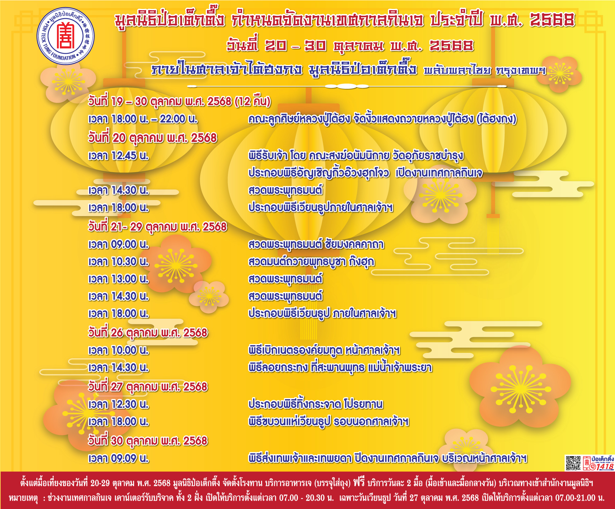 ระหว่างวันที่ 20 - 29 ตุลาคม 2568 มูลนิธิป่อเต็กตึ๊ง จัดให้มีบริการอาหารเจ [บรรจุใส่ถุง] แก่ประชาชนฟรี วันละ 2 มื้อ (มื้อเช้า และ กลางวัน) โดยเริ่มบริการตั้งแต่มื้อกลางวันของวันที่ 29 ตุลาคม ณ บริเวณทางเข้าสำนักงานมูลนิธิฯ ทั้งนี้ มูลนิธิฯ ขอความกรุณาประชาชนผู้เข้ารับบริการอาหารเจนำถุงหิ้ว/ถุงผ้ามาบรรจุอาหารด้วยทุกครั้ง