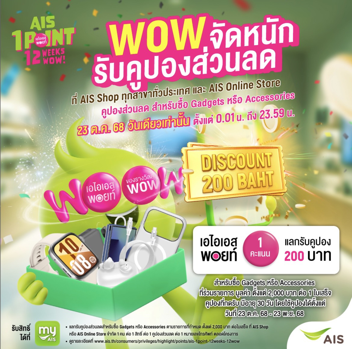 นอกจากนี้ในโอกาสครบรอบ 35 ปี เอไอเอสขอแทนคำขอบคุณลูกค้า มอบสิทธิพิเศษผ่านแคมเปญสุดยิ่งใหญ่ “AIS 1 POINT 12 WEEKS 12 WOW” ที่แจกใหญ่ไม่มีหยุด โดยว้าวนี้เอาใจสาย Gadget และ Accessories โดยเฉพาะ เพียงใช้ AIS Points 1 คะแนน* แลกรับฟรี! ส่วนลด 200 บาท สำหรับซื้อสินค้ากลุ่ม Gadget หรือ Accessories มูลค่า 2,000 บาท ต่อใบเสร็จ (*เฉพาะสินค้าที่ร่วมรายการ) กดรับสิทธิ์ได้ในวันที่ 23 ตุลาคม 2568 วันเดียว ผ่านแอป myAIS เท่านั้น พิเศษ! สามารถใช้สิทธิ์ได้ในงาน Thailand Mobile Expo 2025 รวมถึง AIS Shop ทุกสาขา และ AIS Online Store จนถึงวันที่ 23 พ.ย. 68 สามารถดูรายละเอียดเพิ่มเติมได้ที่ https://www.ais.th/consumers/privileges/highlight/points/ais-1point-12weeks-12wow