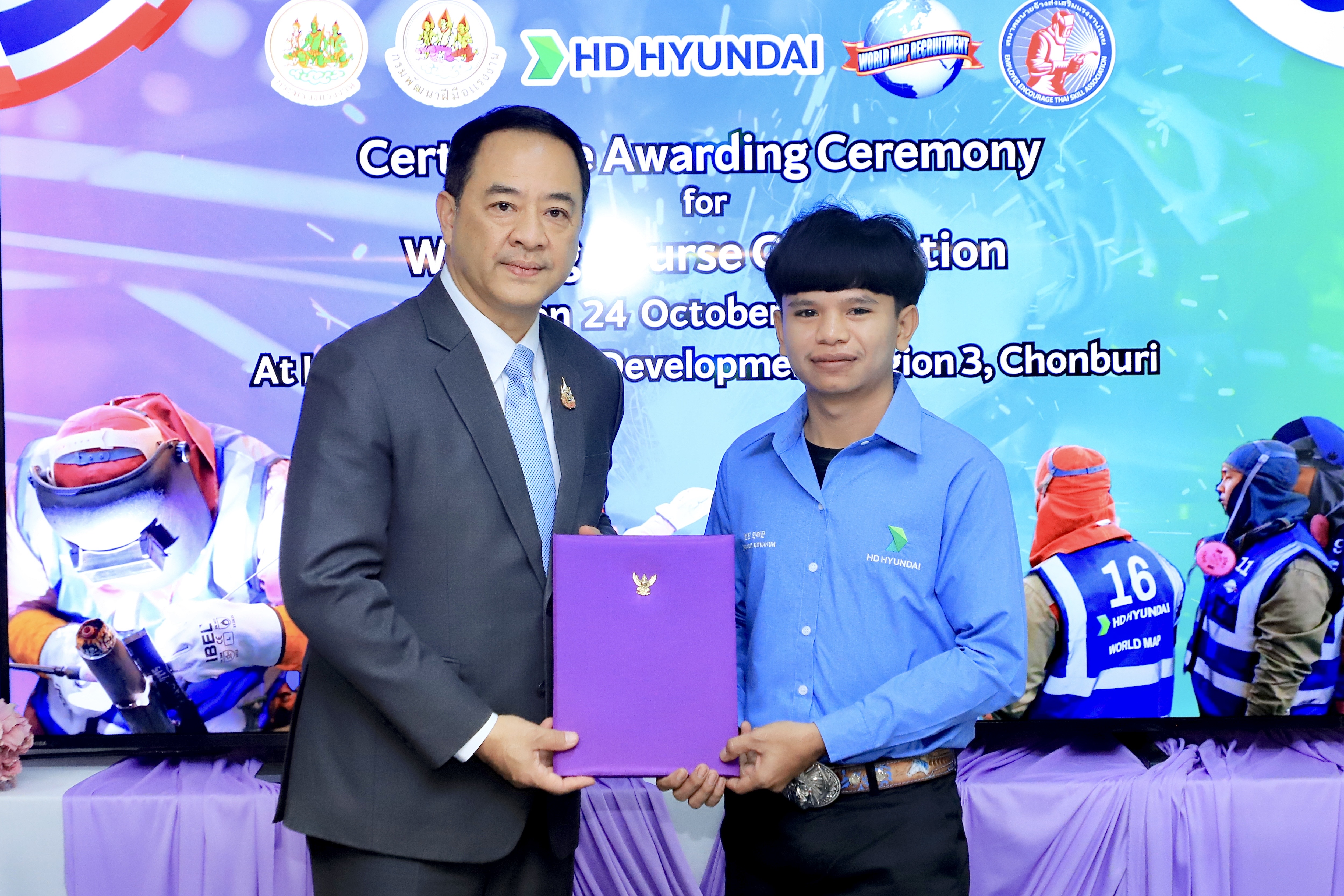 นายสมาสภ์ กล่าวเพิ่มเติมว่า การจัดงานในวันนี้มีกิจกรรมมากมาย อาทิ การทดสอบมาตรฐานฝีมือแรงงานแห่งชาติ และการพัฒนาฝีมือแรงงานด้านเทคโนโลยีขั้นสูงและรองรับทักษะแห่งอนาคต (Future Skills) ด้าน Automation, AI, Robotics, และ Semiconductor บูธแสดงนวัตกรรม นอกจากนี้กระผมยังได้มอบวุฒิบัตรให้แด่ผู้ผ่านการฝึกอบรมหลักสูตรการเชื่อม FCAW 3G และ GTAW 6G (FCAW 3G and GTAW 6G WELDING) สำหรับอุตสาหกรรมต่อเรืออีกด้วย สำหรับในปีงบประมาณ พ.ศ. 2569 กรมพัฒนาฝีมือแรงงานมีเป้าหมายพัฒนากำลังแรงงานในเขต EEC จำนวน 3,000 คน ภายใต้หลักสูตร EEC Model Type B ซึ่งเป็นหลักสูตรที่สถานประกอบกิจการร่วมกำหนด ออกแบบ และพัฒนาหลักสูตรการฝึกอบรม เพื่อให้การพัฒนาทักษะตรงกับความต้องการจริงของภาคอุตสาหกรรม