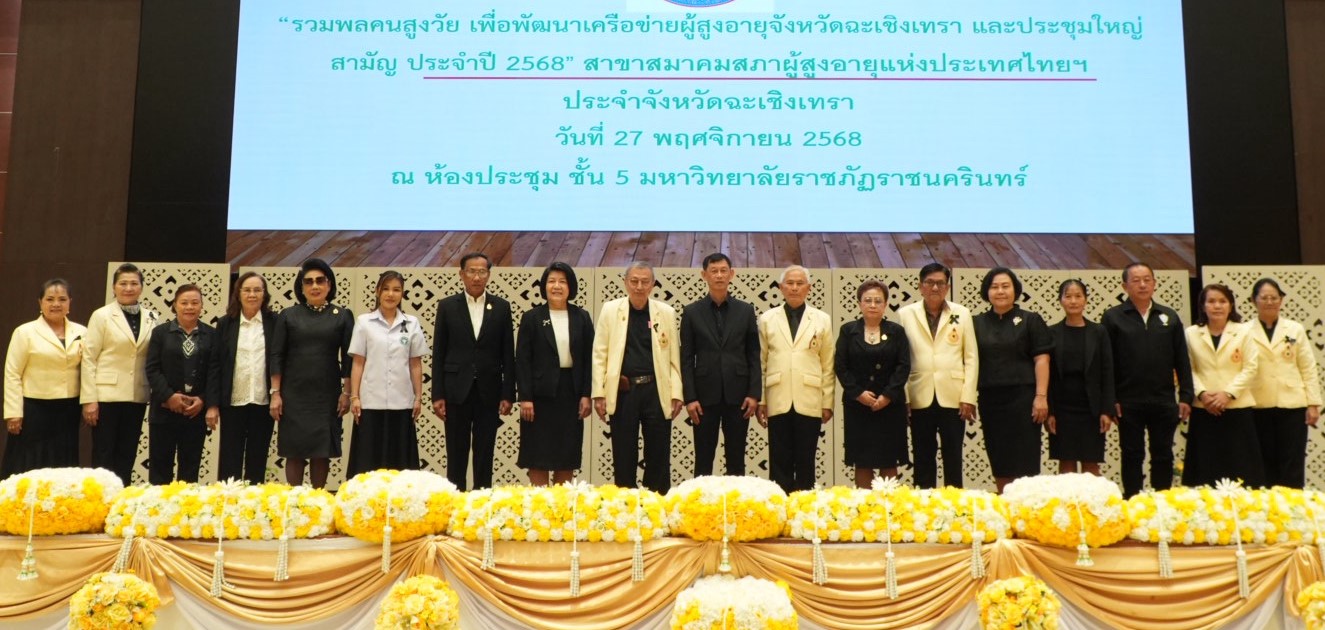 วันที่ 27 พ.ย.ที่ห้องประชุมชั้น 5 มหาวิทยาลัยราชภัฏราชนครินทร์ อำเภอเมืองฉะเชิงเทรา นายประสิทธิ์ อินทโชติ รองผู้ว่าราชการจังหวัดฉะเชิงเทรา เป็นประธานเปิดงาน “รวมพลคนสูงวัย เพื่อพัฒนาเครือข่ายผู้สูงอายุจังหวัดฉะเชิงเทรา และประชุมใหญ่สามัญประจำปี 2568” จัดโดยสาขาสมาคมสภาผู้สูงอายุแห่งประเทศไทย ในพระราชูปถัมภ์สมเด็จพระศรีนครินทราบรมราชชนนี ประจำจังหวัดฉะเชิงเทรา โดยมีนายอภิสิทธิ์ โฉมศรี ประธานสาขาฯ คณะกรรมการ ที่ปรึกษา ตลอดจนสมาชิกเครือข่ายผู้สูงอายุจากทุกตำบลและอำเภอ รวมกว่า 400 คน เข้าร่วมเพื่อร่วมกันขับเคลื่อนแนวทางการพัฒนาคุณภาพชีวิตผู้สูงอายุในฟจังหวัดฉะเชิงเทราอย่างเป็นระบบ และยั่งยืน