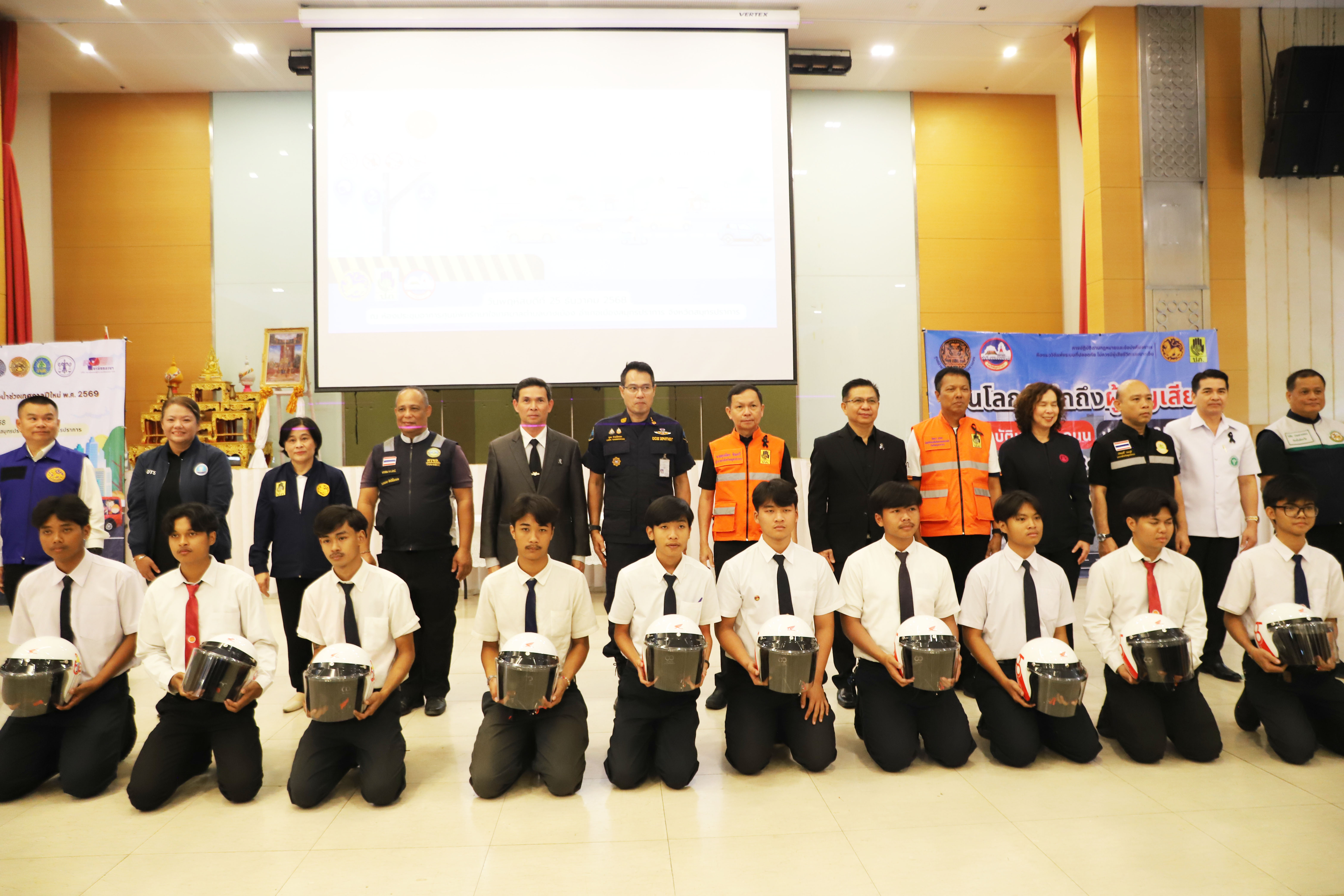 วันที่ 25 ธ.ค.นายศุภมิตร ชิณศรี ผู้ว่าราชการจังหวัดสมุทรปราการ เป็นประธานเปิดกิจกรรม “วันป้องกันอุบัติภัยแห่งชาติและวันโลกรำลึกถึงผู้สูญถึงผู้สูญเสียจากอุบัติเหตุทางถนน” (World Day of Remembrance for Road Traffic Victims) ประจำปี 2568 ที่ห้องประชุมอาคารศูนย์พักรักษาใจ เทศบาลตำบลบางเมือง อ.เมืองฯ จ.สมุทรปราการ จากนั้นเป็นประธานเปิดศูนย์ปฏิบัติการป้องกันและลดอุบัติเหตุทางถนนและทางน้ำในช่วงเทศกาลปีใหม่ พ.ศ. 2569 และมอบหมวกนิรภัยให้กับนักเรียน และเยาวชน รณรงค์สวมหมวกนิรภัย 100% เพื่อรณรงค์ป้องกัน และลดอุบัติเหตุทางถนน และทางน้ำในช่วงเทศกาลปีใหม่ 2569 รวมทั้งอำนวยความสะดวกให้กับประชาชนในช่วงดังกล่าว โดยมี นายวิวัฒน์ จันทร์โอภาส ปลัดจังหวัดสมุทรปราการ พร้อมด้วยหัวหน้าส่วนราชการ เจ้าหน้าที่ตำรวจ เจ้าหน้าที่ฝ่ายปกครอง และหน่วยงานที่เกี่ยวข้องเข้าร่วม