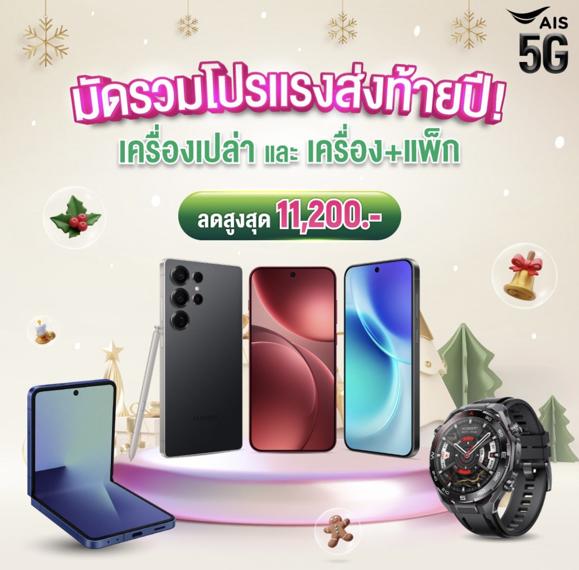 ขณะที่ฝั่ง Android ก็แรงไม่แพ้กัน นำโดย Samsung Galaxy S25 Ultra เครื่องเปล่าเริ่ม 46,900 บาท ลดทันที 10,000 บาท, Samsung Galaxy S25+ | S25 เครื่องพร้อมแพ็กเกจเริ่ม 17,900 บาท หรือเครื่องเปล่าเริ่ม 29,900 บาท ลดทันที 9,000 บาท, และ Samsung Galaxy Z Flip7 เครื่องพร้อมแพ็กเกจเริ่ม 29,700 บาท หรือเครื่องเปล่าเริ่ม 40,900 บาท ลดทันที 8,000 บาท แถม ฟรีกระเป๋า Aristotle และ AIS Care+ with Samsung Care Services ฟรี 1 ปี เสริมด้วยดีลสายแก็ดเจ็ต Huawei Watch ลดสูงสุด 4,400 บาท และโปร แลก AIS Points ลดหลักพัน สำหรับรุ่นฮิตอย่าง vivo X300 series, OPPO Find X9 series และ Redmi Note 14 series ตั้งแต่วันนี้ – 13 มกราคม 2569 ที่ AIS Shop ทุกสาขาเท่านั้น!