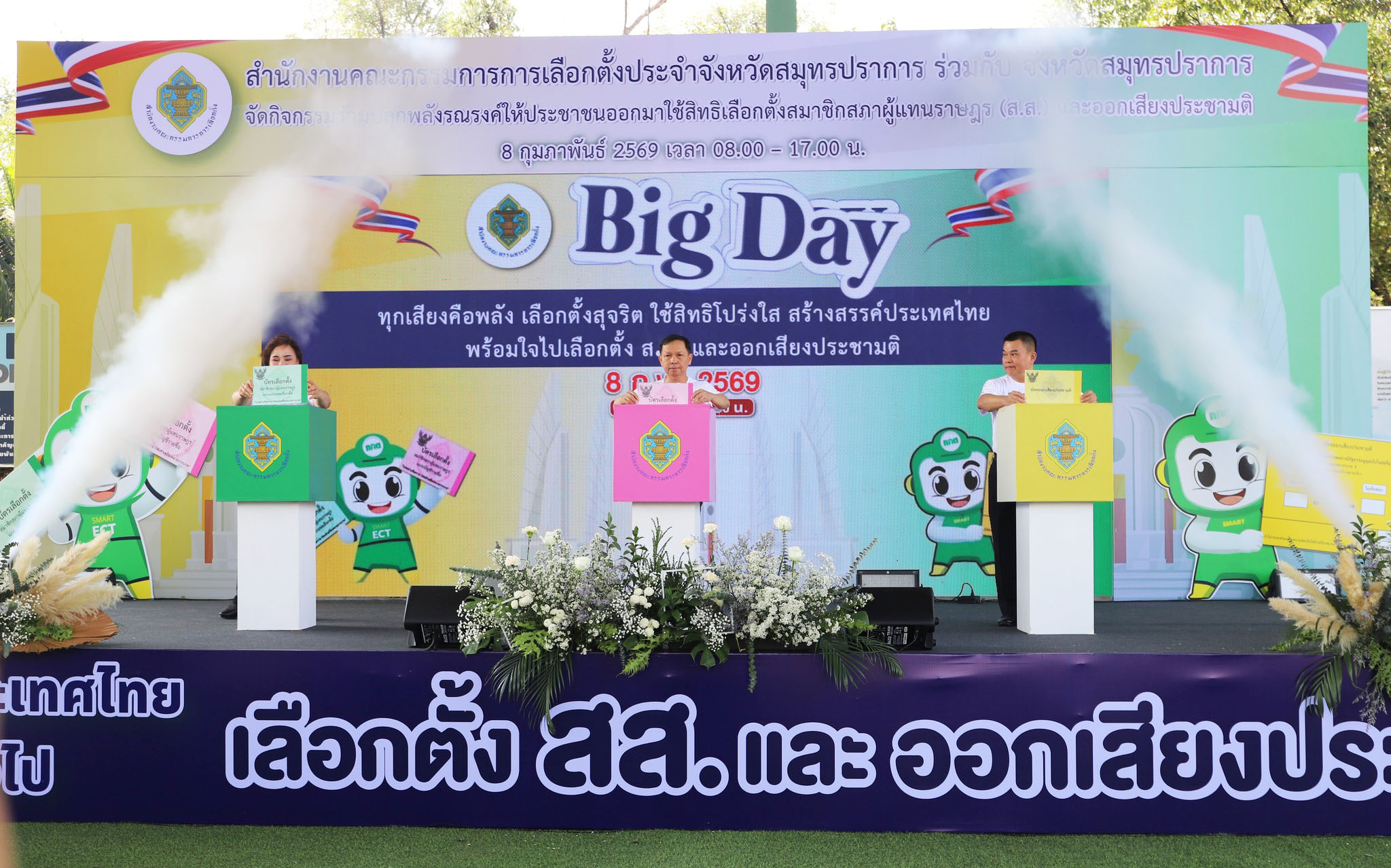 ทั้งนี้เพื่อให้การจัดการเลือกตั้งและการออกเสียงประชามติ เป็นไปด้วยความเรียบร้อยสุจริต เที่ยงรรรม และชอบด้วยกฎหมาย สำนักงานคณะกรรมการการเลือกตั้งประจำจังหวัดสมุทรปราการ ร่วมกับภาคีเครือข่ายต่างๆ ในพื้นที่ จัดกิจกรรมรณรงค์และประชาสัมพันธ์การเลือกตั้งสมาชิกสภาผู้แทนราษฎร (ส.ส.) และการออกเสียงประชามติ (Big Day) ขึ้น