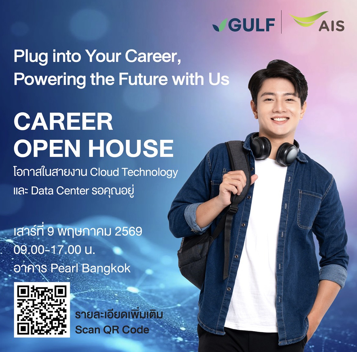 GULF และ AIS เดินหน้าตอกย้ำบทบาทผู้นำด้านโครงสร้างพื้นฐานที่เคียงข้างคนไทย จัดงาน Open House เปิดบ้านครั้งสำคัญเพื่อรับสมัครงานบุคลากรสายเทคหลากหลายสาขา อาทิ Data Center Operation, Cloud Product, Data Analytics, Network Operations Center, Technical Sales, International Connectivity มาร่วมเป็นส่วนหนึ่งของการขับเคลื่อนธุรกิจดิจิทัลที่กำลังขยายตัวอย่างต่อเนื่อง เพื่อรองรับเทคโนโลยีแห่งอนาคต ทั้ง Data Center, Cloud, AI, Digital Infrastructure, Enterprise Digital Services และ Digital Bank สะท้อนถึงทิศทางการเติบโตของ GULF และ AIS ในการยกระดับขีดความสามารถด้านดิจิทัลของประเทศไทย ผ่านการพัฒนาโครงสร้างพื้นฐานเทคโนโลยีที่มีความสำคัญต่อภาคธุรกิจ อุตสาหกรรม และเศรษฐกิจดิจิทัลในระยะยาว
